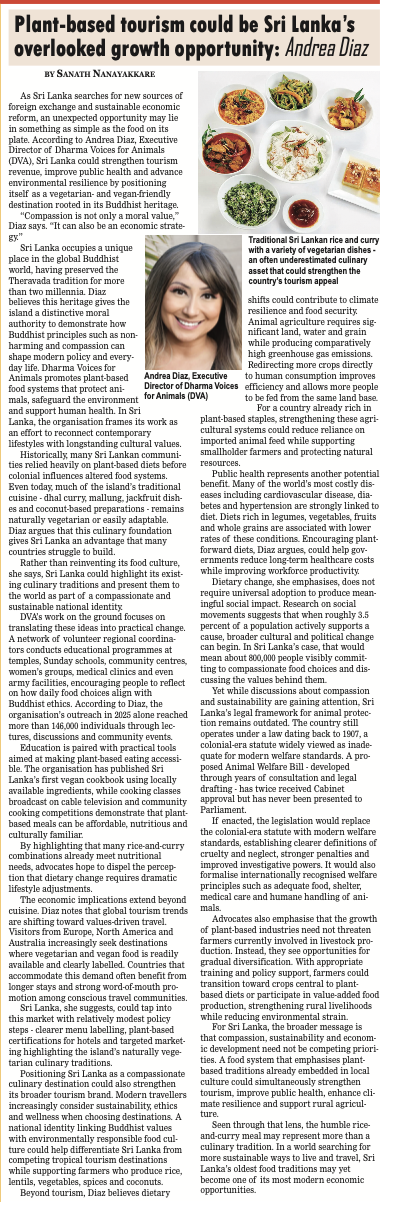 As Sri Lanka searches for new sources of foreign exchange and sustainable economic reform, an unexpected opportunity may lie in something as simple as the food on its plate. According to Andrea Diaz, Executive Director of Dharma Voices for Animals (DVA), Sri Lanka could strengthen tourism revenue, improve public health and advance environmental resilience by positioning itself as a vegetarian- and vegan-friendly destination rooted in its Buddhist heritage. “Compassion is not only a moral value,” Diaz says. “It can also be an economic strategy.”
